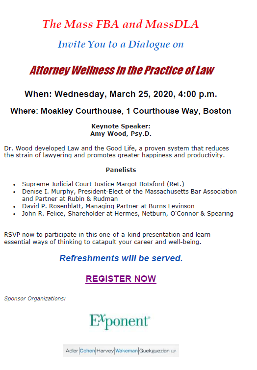 The Massachusetts Chapter of the Federal Bar Association and the Massachusetts Defense Lawyers Association invite you to a Dialogue on attorney wellness and the practice of law.