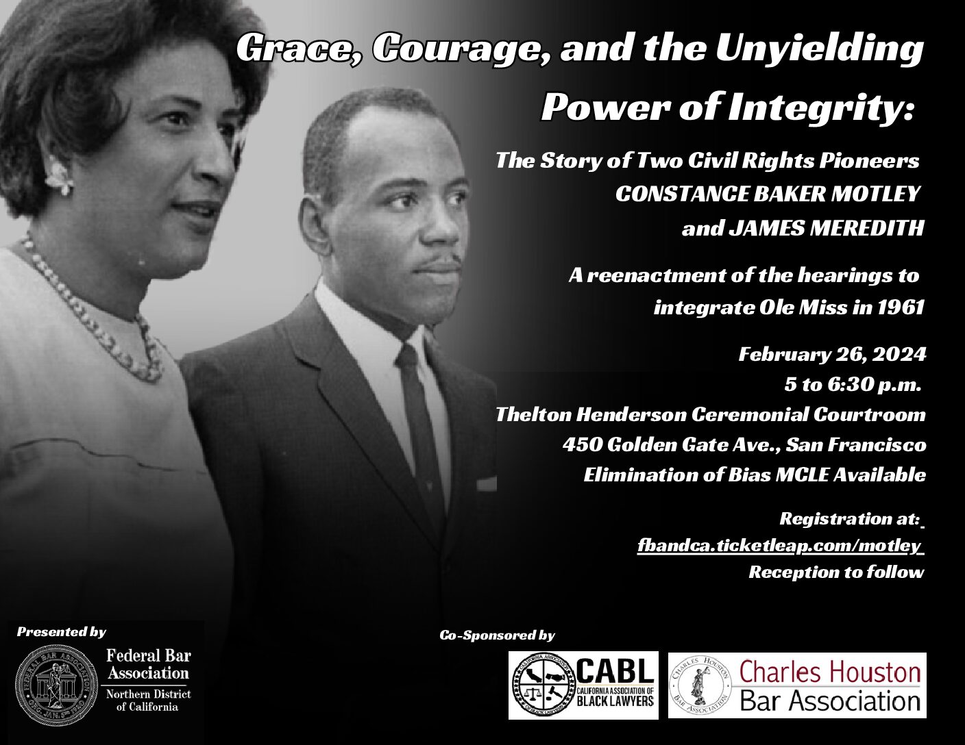 “Grace, Courage and the Unyielding Power of Integrity: The Story of Two Civil Rights Pioneers---Constance Baker Motley and James Meredith” will be a reenactment of the admissions hearings to allow Meredith to enter Ol’Miss in 1961. Tickets: https://fbandca.ticketleap.com/motley/ For questions regarding this program, please contact...